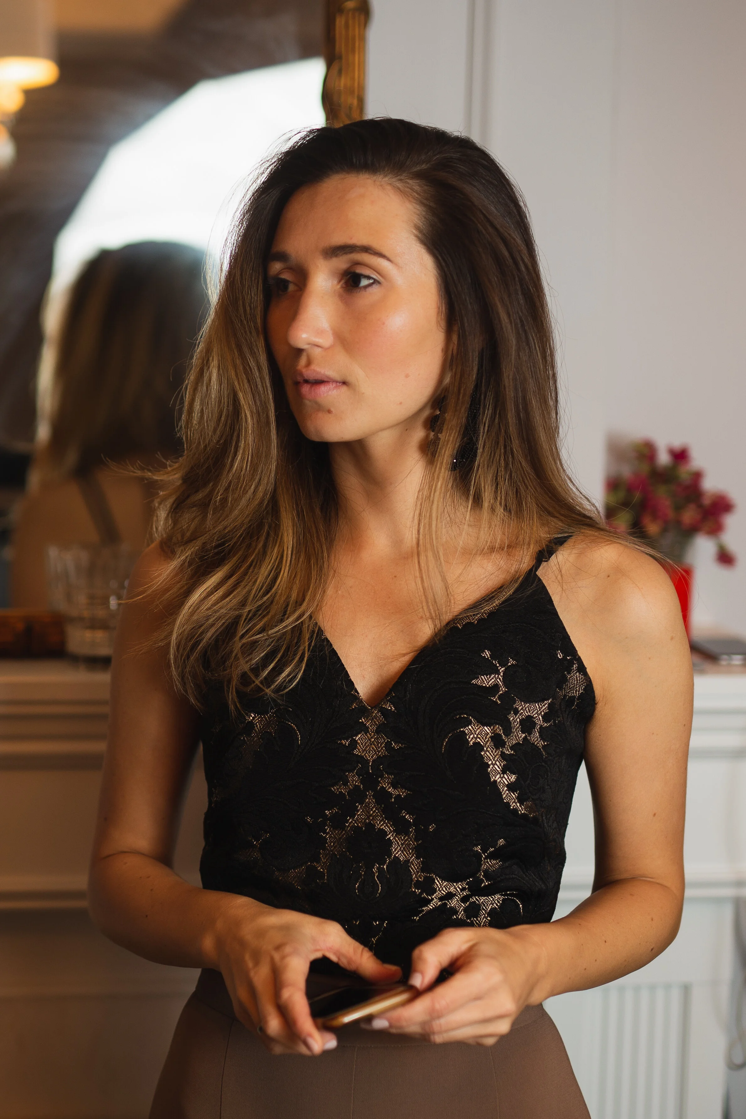 Cropped tank with structured sensibility, designed to match the top of the palazzo or anything high-waisted. As a shell under a jacket or a statement piece on its own, it dazzles with a neckline plunge cut to your preference and a bust sewn custom to your measurements